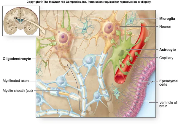 Section titled “What the Heck is a Glia?”In addition to its 100 billion neurons, the brain also contains 10 to 50 times that many supporting cells, which provide physical, biochemical and functional support for the neurons. These cells are glia, and here's a picture of them. We're going to concentrate on just one type of glia, but to learn more about the other types, click here