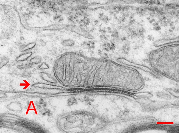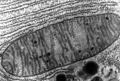 Figure 7 shows one inside a nerve cell in the cerebellum, the section of the brain where we operate our muscles and think about motion. The mitochondrion (singular of mitochondria) is lying sideways in this photo, about an inch to the right of the red arrow. The interior structure seems to be dissolving due to free radical damage.