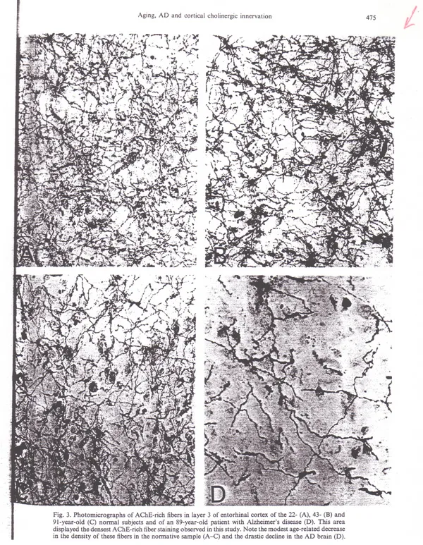 Figure 2 above shows four different pictures of the cerebral cortex, the part of the brain where we think. The upper left hand corner shows the brain of a 22-year-old, thick with neurons. In the upper right corner is a 43 year old. The Xerox this scan comes from darkened and thickened the image of the cells, but you should be able to see that there is more white space between the cells. No wonder, for we lose about 31 million neurons per year (out of our original 100 billion, factory installed). Now look at the lower left corner. This is what a small area of cortex looks like after another 48 years of neuron loss. The 91-year-old brain just ain't what it was at 22. And now, for the sad news in the lower right corner – this is what the brain of a person with Alzheimer's dementia looks like. They've lost just too many neurons. This person would have a great deal of trouble with memory and higher thinking functions. What you are seeing above is how those thread-like parts of the cell are vulnerable to damage, and disappear as time passes.