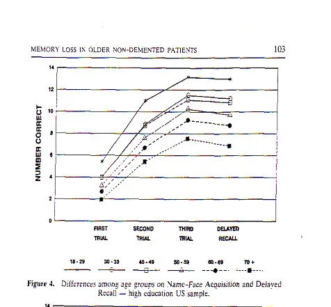 In this test, people are shown photographs of about twenty different people and told their names. They are then asked to match names to faces and are corrected if they've erred. The top line shows the performance of people in their twenties. Shown faces and names they've never seen before, they remember 6 names on the first try, eleven on the second, and thirteen on the third try. Wait a while, and they still can match a name to about thirteen faces. The second line from the top shows how well a group of people in their thirties score. The bottom line shows the score of people over 70 years of age. Raw processing power is never higher than it is before the age of thirty.