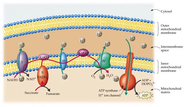 Our marvelous mitochondria take in the fat and carbohydrates we've eaten and burn them in a multiple step process that ekes out most of the energy potential in our food. Figure 5 shows that multiple step process, going from left to right and producing energy at every step. You see just a tiny part of the entire mitochondrion. At several places in the process, acid is produced, labeled H+. At step II, a substance called CoQ is required. CoQ is more familiarly known as coenzyme Q10.