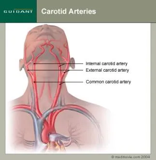 First are the two great common carotid arteries in the neck, one on each side of the windpipe. We'll ignore the external carotid arteries which transport blood to the face and scalp. Our concern is the internal carotid arteries which, between the two of them, carry about a pint and a half of blood a minute to the brain.