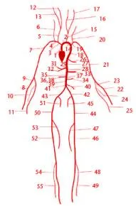 No other organ claims as great a fraction of the five quarts per minute our heart produces when we are at rest. Looking at the arterial road map of the body, the artery to the right leg (numbered 50 below), when the leg is at rest, carries half that amount.