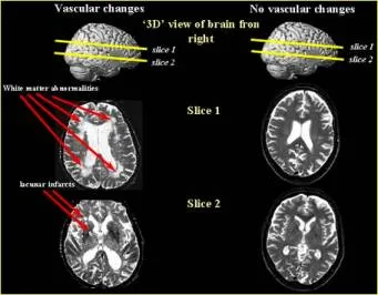 On the right is an MRI of a normal brain. The white areas you see represent normal fluid in the fissures between the gyri. The arrows on the image of the brain on the left indicate abnormal white areas, evidence of small strokes. These cerebral events often fail to cause the typical weakness and numbness of a larger stroke, but when enough occur, thinking becomes more difficult.