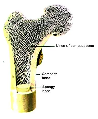 Here is an engineering analysis of the forces on that femur while standing. The blue lines show the lines of compressive force as the femur transfers the weight of your upper body down to the lower part of the bone and toward the ground. If an engineer were to replace the bone with cathedral arches, this is the shape they would take. The red lines of tension show the stretching of the outer part of the bone required to carry the load. Were the bone a bridge, these lines of tension would correspond to steel girder or cable bracing, required to prevent the masonry from pulling apart. Not illustrated in figure 3 above is the tough connective tissue permeating the microstructure of the bone, aiding in withstanding tensile stress.