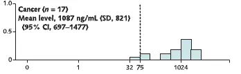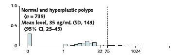 (Looking at this diagram, the height of the bars represents the number of people with that result, so that the left hand bars, sitting on the 0 on the x-axis, show that most people with no polyp, or a normal polyp, show no hemoglobin in the stool. The lower bars further to the right show that a few of such people have small amounts of hemoglobin in the stool, but the great majority measure under 75 nanograms/milliliter (ng/ml) of stool.)